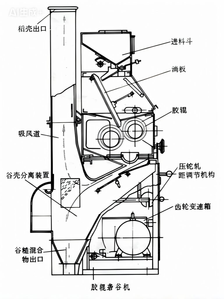 Grains are fed between rubber rollers or impact rotors to remove outer layers, followed by aspiration to separate husk/peel.